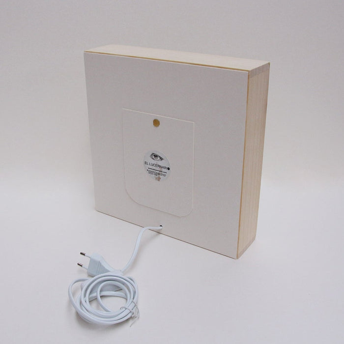 La pantalla de la lámpara es de papel y la estructura de la caja está realizada en madera. La tapa posterior es de cartón rígido blanco y tiene una apertura por la que acceder fácilmente a la bombilla.