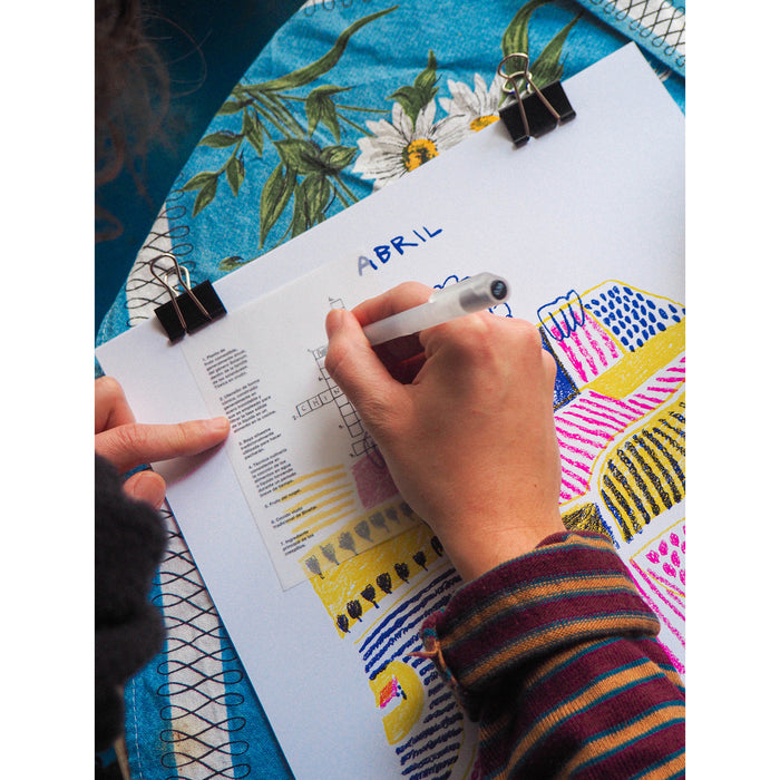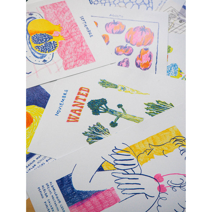 - 12 láminas ilustradas impresas en risografía en papel reciclado.