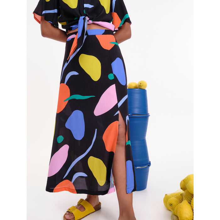 Falda midi con abertura lateral y goma trasera para ajustar la talla.