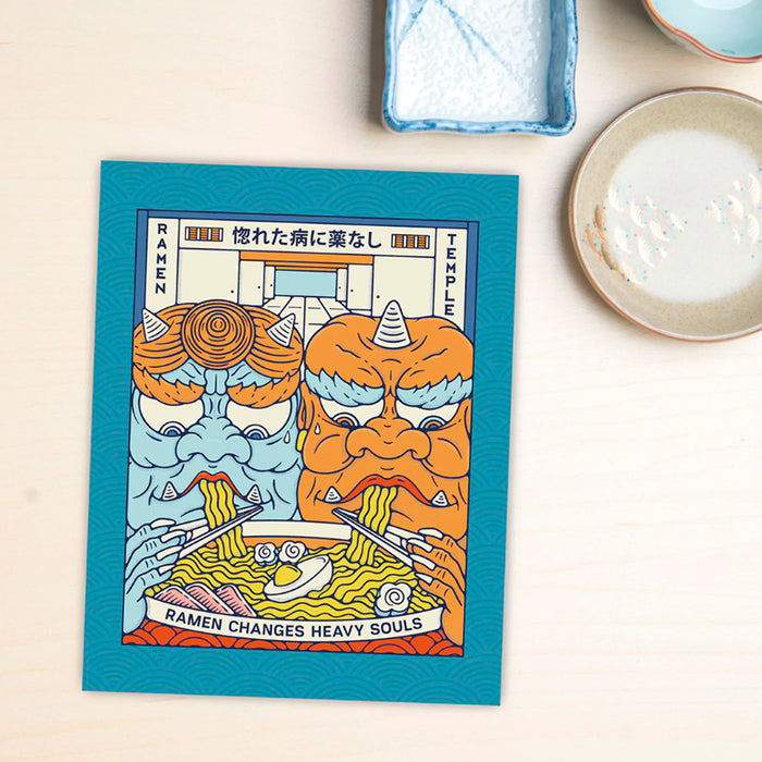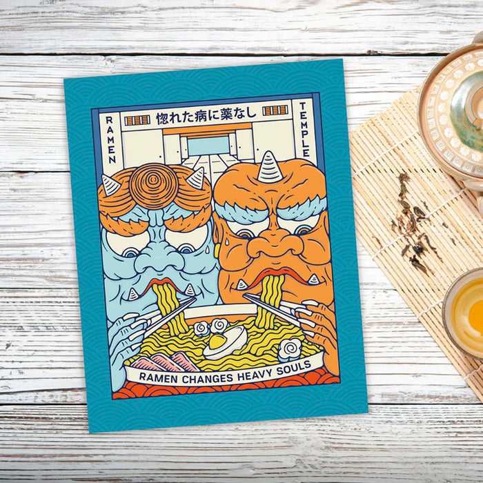 Libreta con portada estilo japonés con ilustración de dos criaturas oni comiendo ramen y e texto "Ramen Temple | Ramen Changes Heavy Souls".