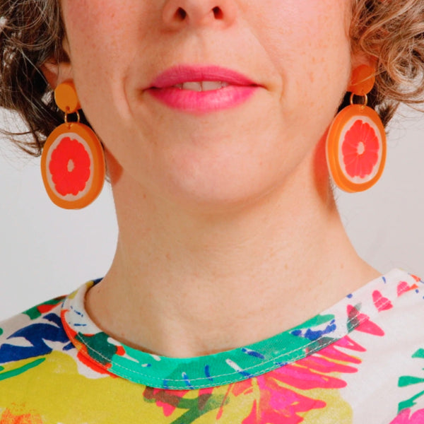 El pendiente pomelo es de metacrilato y el cierre de acero inoxidable hipoalergénico color dorado.