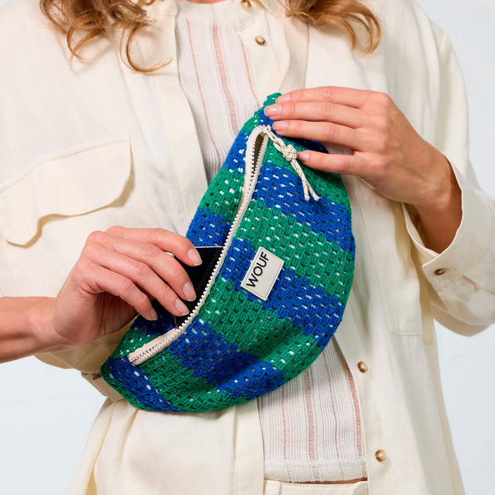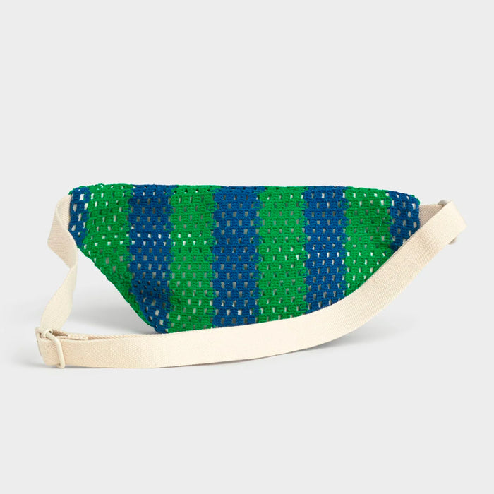 La riñonera Mistral, elaborada en ganchillo con un estampado de rayas, es una opción práctica y cómoda para llevar tus pertenencias. Con su correa ajustable y un único compartimento, combina funcionalidad y estilo. Esta riñonera aporta un aire mediterráneo relajado y desenfadado a tu día a día.