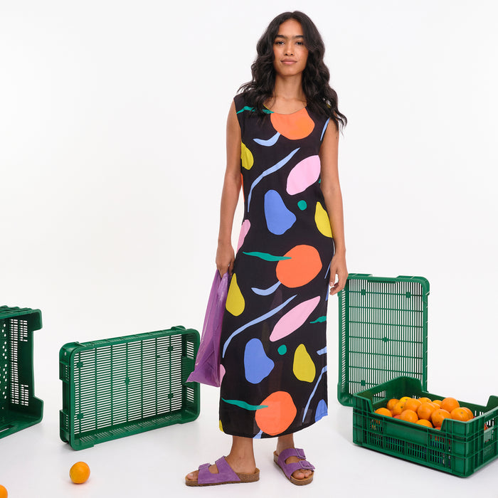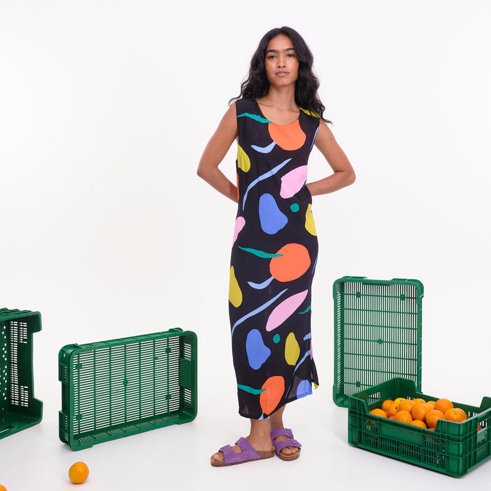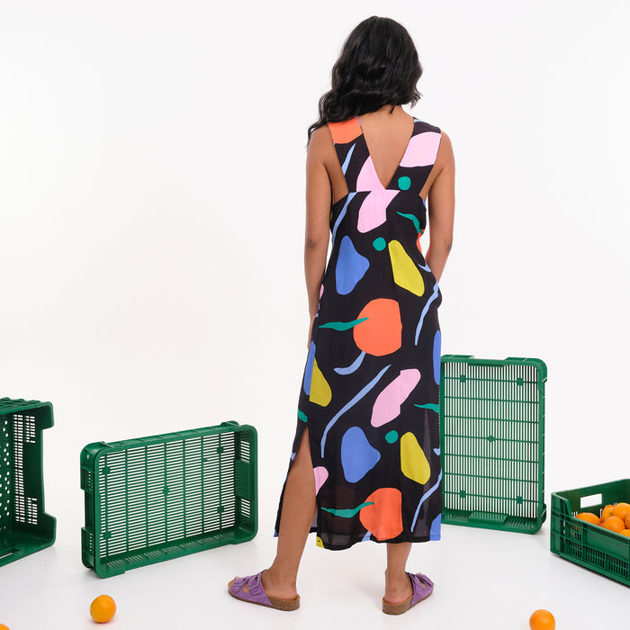 Vestido tobillero de corte recto con aberturas laterales. Detalle de tirantes cruzados en la espalda.